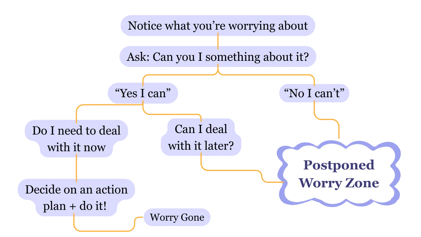 - One way to shift worries into action, or place them in the PWZ, is by practicing a simple thought exercise where you ask yourselves the questions shown in the image below. This helps us pause, take a step back, and evaluate whether a worry needs immediate attention or if it can be set aside for later.
