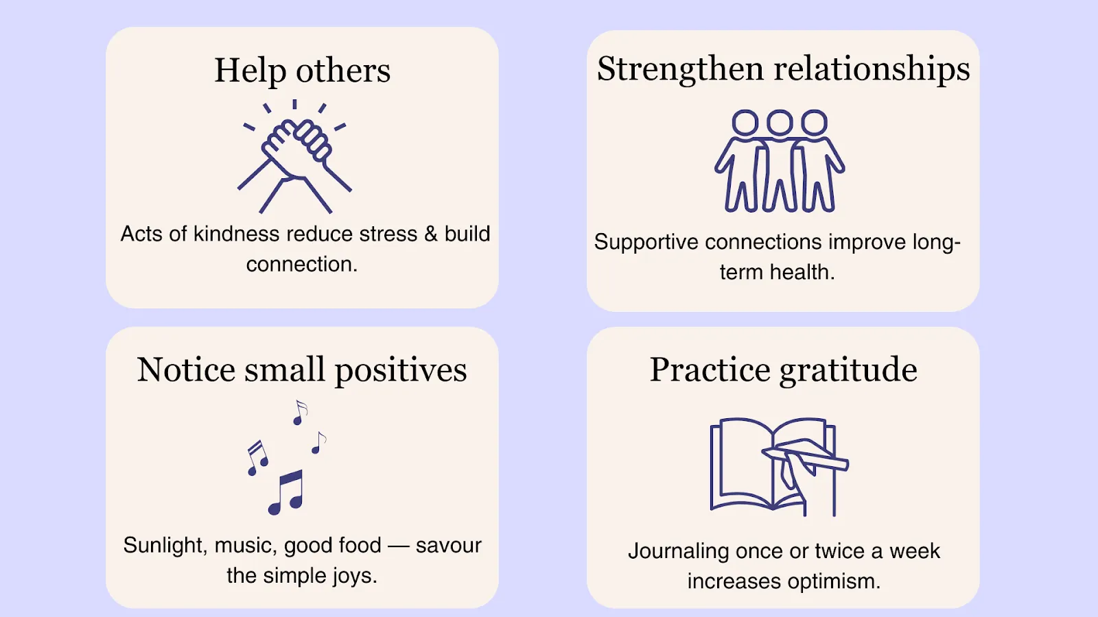 - Positivity: strengthen mood through gratitude, connection, and kindness.